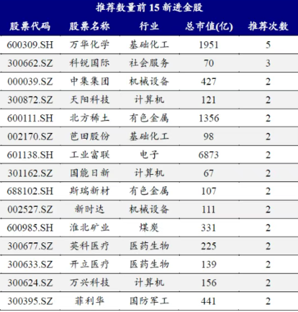 而在8月新进金股名单(相对于7月新进金股名单)中,万华化学(600309)合计被推荐次数居首,达到了5次。科锐国际(300662)排名第二,合计被推荐了3次。