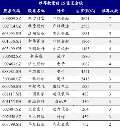 个股层面,开源证券数据显示,8月各家券商推荐的金股中,被推荐次数最靠前的是东方财富(300059)和牧原股份(002714),合计被推荐次数均达7次。洛阳钼业(603993)紧随其后,合计被推荐了5次。