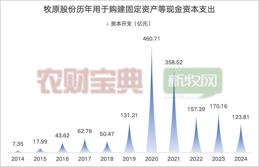 2019-2023年,牧原用于购建固定资产、无形资产和其他长期资产的资本开支总计高达1402亿元;上市以来该项支出累计金额超1584亿元。