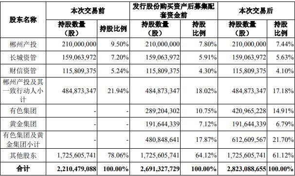 截至报告书签署日,公司总股份为2210479088股,郴州产投直接持有公司210000000股,占上市公司总股份的9.50%,为上公司控股股东,长城资管、财信资管为郴州产投的一致行动人,分别直接持有公司159063972股和115809375股股份,分别占公司总股份的7.20%和5.24%。本次交易完成后,有色集团、黄金集团将分别持有公司420965228股股份、191644339股股份,分别占公司总股份的14.91%和6.79%,合计持股比例为21.70%;公司控股股东将变更为有色集团,实际控制人将变更为湖南省国资委。本次交易前后公司的股本结构如下表所示: