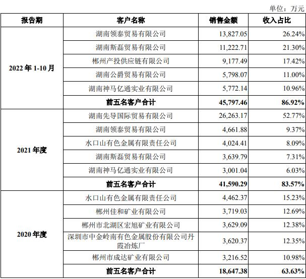 草案显示,标的公司是一家以铅锌矿采选为主业的国有矿山企业,拥有完整的探矿、采矿、选矿体系,是湖南省主要铅锌原料生产基地之一。报告期内,标的公司向前五大客户销售情况如下表所示:
