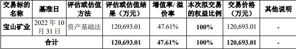 草案显示,公司拟通过向交易对方发行股份的方式,购买其合计持有的宝山矿业100%股权。本次交易完成后,宝山矿业将成为公司全资子公司。本次交易价格(不含募集配套资金金额)120693.01万元,其评估情况如下: