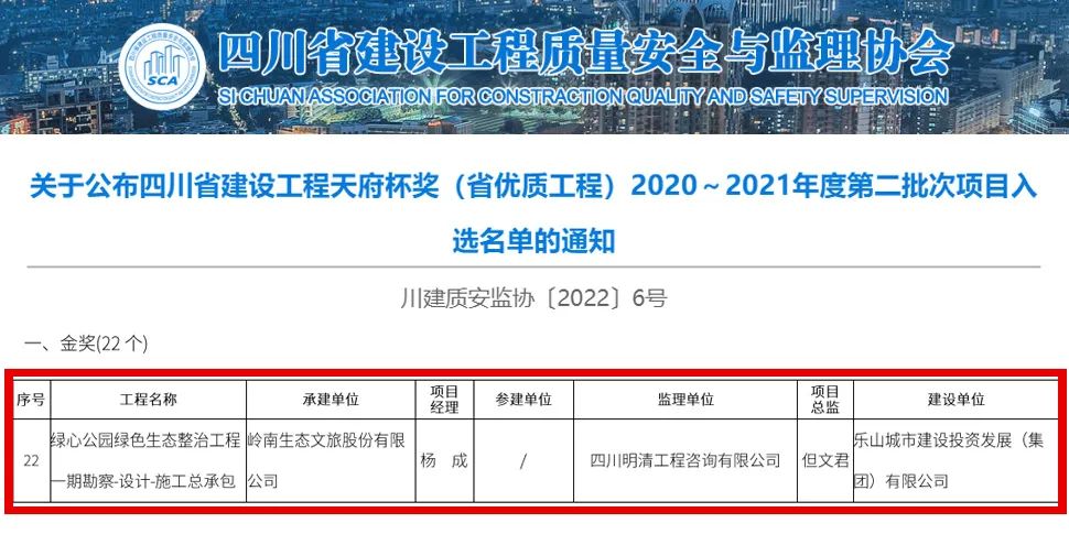 “天府杯”,是四川省建设工程质量的最高荣誉奖,入围的各类工程,质量皆达到省内一流水平。经严格评审,本期22个项目突围“夺金”,岭南股份项目是唯二入围的园林工程之一。