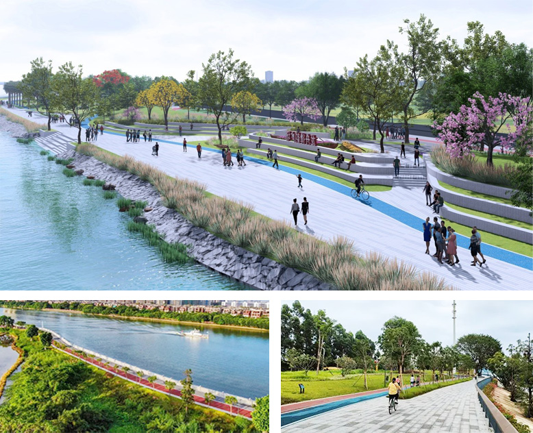东莞市道滘镇碧道二期工程(第一标段)设计施工总承包项目,是重点民生工程,项目建设主要包括水安全提升工程、水环境改善工程、水生态保护与修复工程、景观营造与游憩系统四部分。岭南股份下属设计集团,在设计中通过采用一级堤、二级堤结合的方式,打造多样化堤防,并配合景观、给排水、道路及电气照明等工程措施,结合市政、景观规划,增加景观设施,完善排水系统及片区道路、照明设施等,提升了道滘镇的城市品质,助力道滘实现“河畅、水清、堤固、岸绿、景美”。该项目在2023年初投入使用,人性化的设计理念、完善的配套设施、水清岸绿景色优美吸引了不少群众来这里娱乐和锻炼。