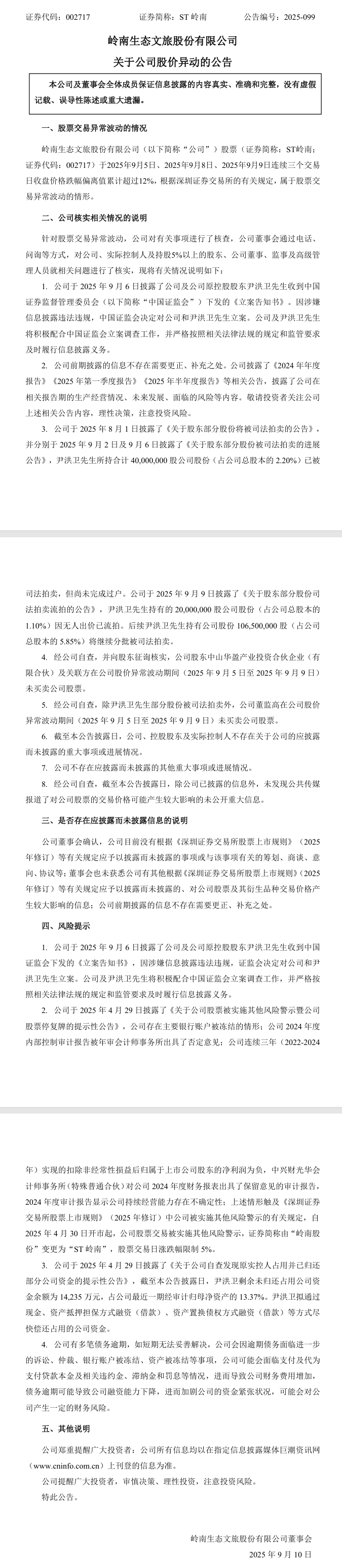 针对股票交易异常波动,ST岭南对有关事项进行了核查,公司董事会通过电话、问询等方式,对公司、实际控制人及持股5%以上的股东、公司董事、监事及高级管理人员就相关问题进行了核实。
