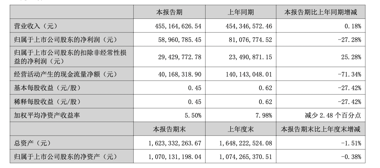 根据公告,公司实现营业收入4.55亿元,同比增长0.18%;归属于上市公司股东的净利润5896万元,同比减少27.28%;扣除非经常性损益后的净利润2942.98万元,同比增长25.28%。