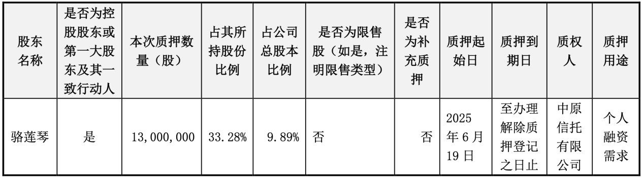 此前,友邦吊顶(002718.SZ)发布公告称,实际控制人之一的骆莲琴因个人融资需求,将其持有的友邦吊顶股份1300万股(占其所持股份比例为33.28%)质押予中原信托。