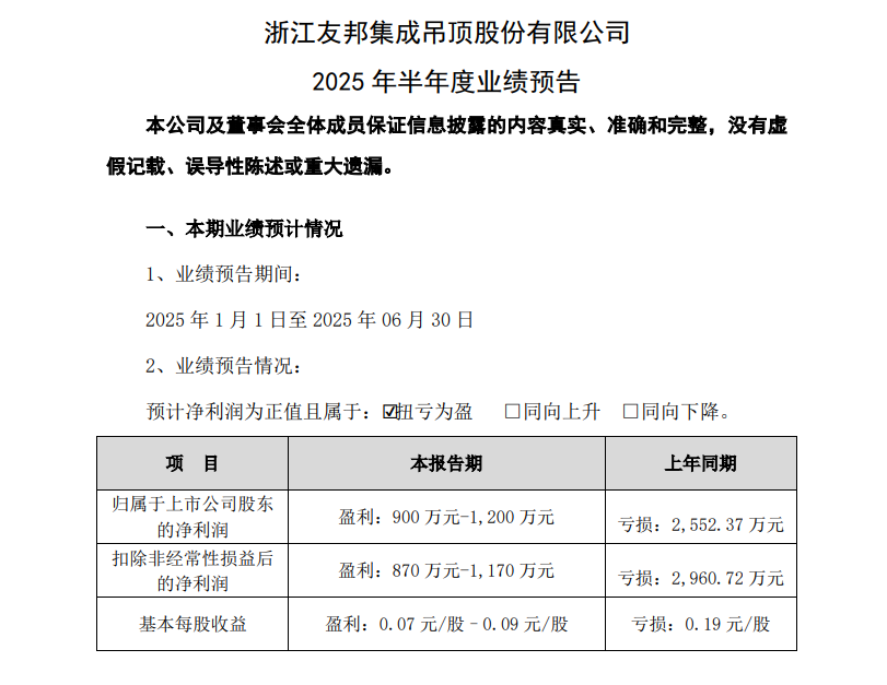 友邦吊顶预计2025上半年归属于上市公司股东的净利润900万元-1200万元,同比扭亏为盈;预计扣除非经常性损益后的净利润870万元-1170万元。