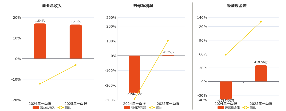 公司营业总收入为1.49亿元,较去年同报告期营业总收入减少479.17万元,同比较去年同期下降3.12%。归母净利润为70.25万元。经营活动现金净流入为419.56万元。