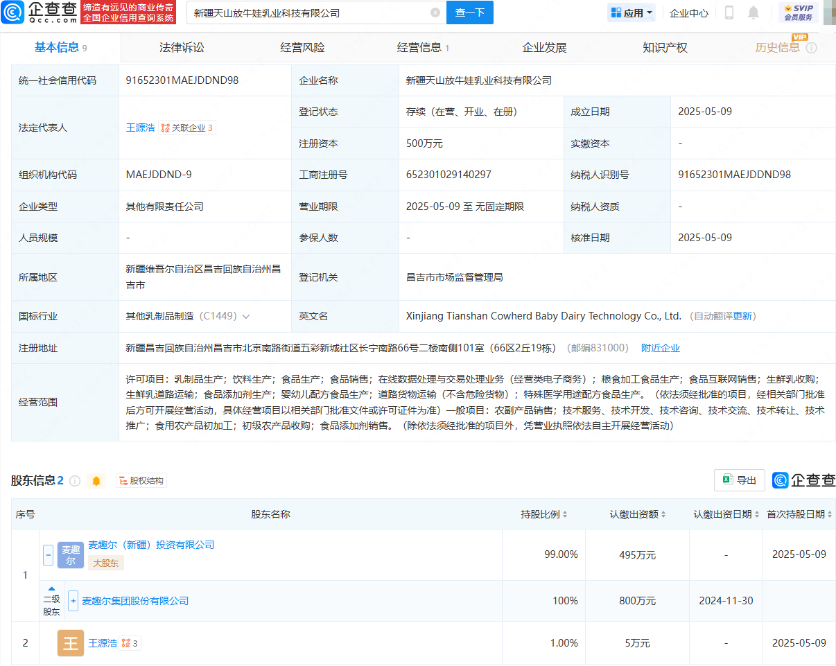 近日,新疆天山大好乳业科技有限公司、新疆天山放牛娃乳业科技有限公司成立,法定代表人均为王源浩,注册资本均为500万元,股权穿透显示,两公司均由麦趣尔(002719)旗下麦趣尔(新疆)投资有限公司、王源浩共同持股。
