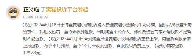 根据黑猫投诉平台显示,多名消费者反馈在购入产品后因追溯到过往违规事件发起退货申请,但遭遇企业拒绝处理,随即引发投诉。截至2025年9月25日,麦趣尔累计投诉已达到2080件,虽然低于伊利2232件,蒙牛2672件,但考虑到麦趣尔相对较小的业务体量,其背后所反映的消费者不满情绪已十分明显。