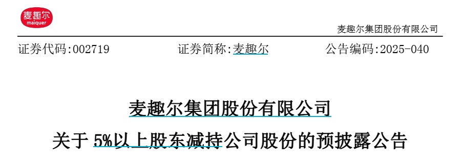 9月24日,麦趣尔(002719)发布股东减持计划公告,公司股东昌吉州国有资产投资经营集团有限公司(以下简称“昌吉州国投”)因自身资金需求,拟自公告披露之日起15个交易日后的3个月内,通过大宗交易或集中竞价方式减持不超过348万股公司股份,减持股份数量占公司总股本的2%。