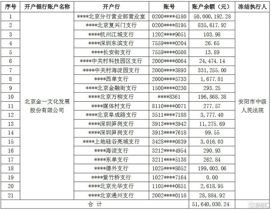 金一文化(002721.SZ)公布,公司近日查询获悉公司名下部分银行账户被冻结。具体情况如下: