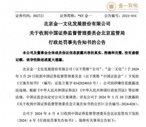 6月5日晚间,北京金一文化发展股份有限公司(以下简称“*ST金一”或“公司”、“金一文化”)发布关于收到中国证券监督管理委员会北京监管局行政处罚事先告知书的公告。公告称,公司因涉嫌信息披露违法违规,北京证监局决定对ST金一及相关责任人给予警告,并处以共计410万元的罚款。