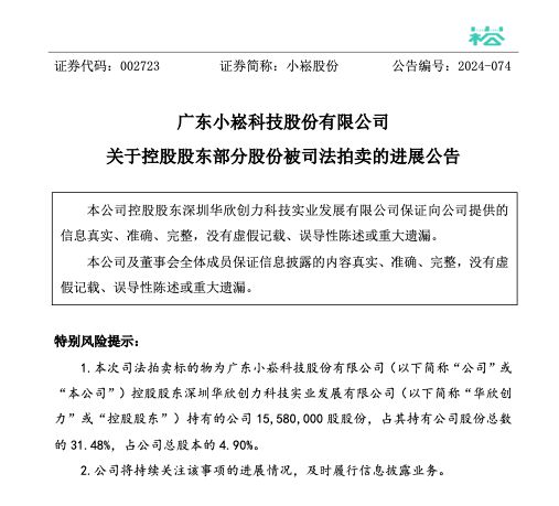 8月16日,广东小崧科技股份有限公司(以下简称“小崧股份”或“公司”)发布关于控股股东部分股份被司法拍卖的进展公告。因买受人尚未交付标的物网拍成交余款,深圳中院裁定重新拍卖、变卖控股股东深圳华欣创力科技实业发展有限公司(以下简称“华欣创力”或“控股股东”)持有的小崧股份15,580,000股股份以清偿债务。此前,小崧股份发布《2024年半年度业绩预告》,预计2024年上半年归母净利润为300万元-450万元,比上年同期下降90.07%-85.10%;预计扣非净利润为254万元-404万元,比上年同期下降91.40%-86.33%。