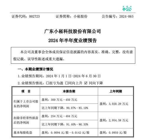 7月5日,小崧股份收到广东证监局《行政监管措施决定书》,原因为4月30日,小崧股份发布2023年年度报告,披露2023年归母净利润为亏损约691.64万元,同比由盈转亏。然而,小崧股份未按规定在1月31日前披露2023年度业绩预告,且截至2023年年报发布也未披露相关业绩预告。对此,广东证监局对小崧股份及董事长彭国宇、总经理卢保山、财务总监温琳采取出具警示函的行政监管措施。