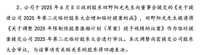 进一步研究发现,此次调整或与小崧股份持股5%股东田野阳光有关。调整公告提及,公司于6月5日收到股东田野阳光提交的临时提案,田野阳光提请将《关于调整2025年限制性股票激励计划(草案)授予规模的议案》作为临时提案提交公司2025年第二次临时股东大会进行审议,且本次调整需经公司股东大会审议。