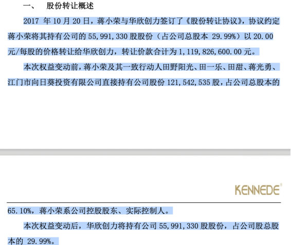 2017年12月,蒋小荣将其所持有的5599.13万股股份(占公司当时总股本的29.99%)以11.2亿元的价格协议转让给深圳华欣创力科技实业发展有限公司(以下简称华欣创力)。