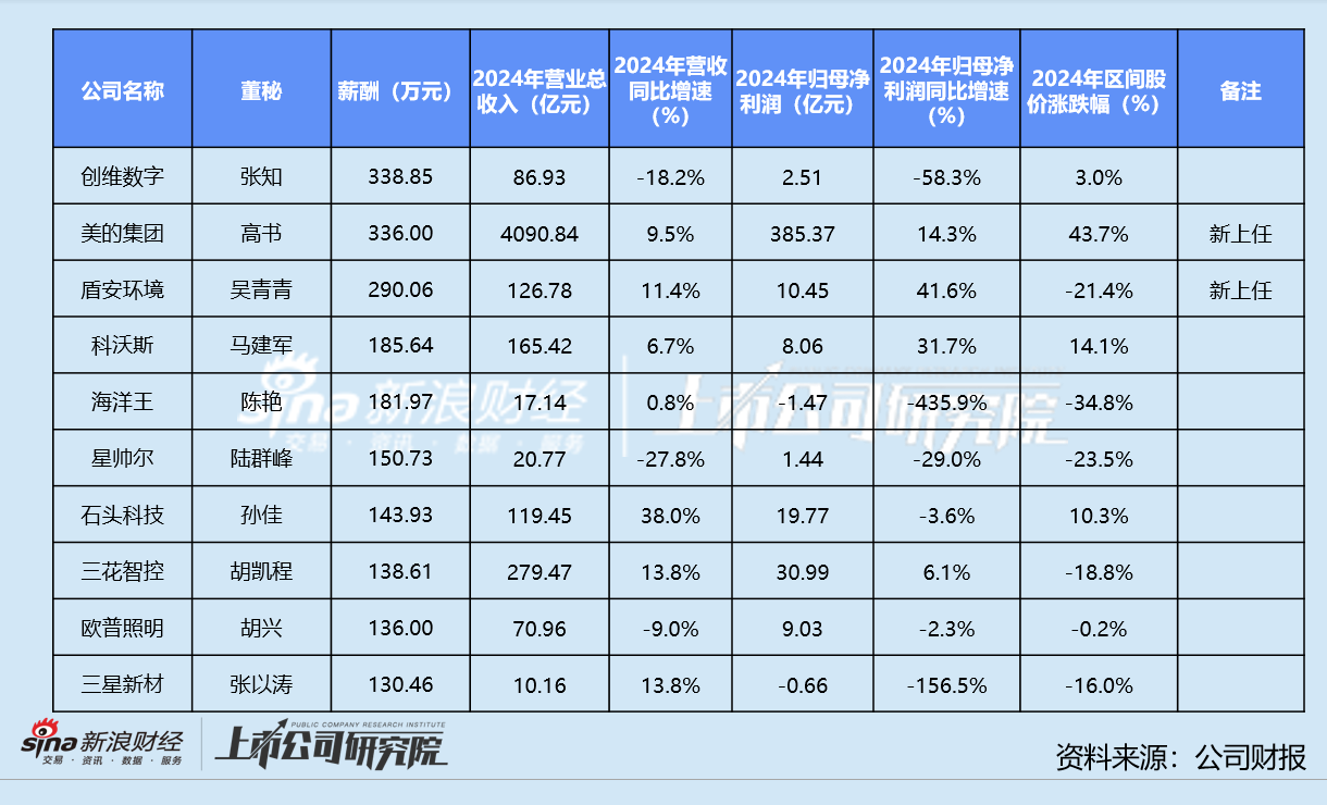 创维数字的董秘张知以338.85万元薪酬稳坐第一,与第二名美的集团董秘高书的薪酬不相上下。此外,他还持有公司约323.9348万股股份。财报显示,张知于1994年便加入了创维集团,历任中国区营销部总经理助理、副总经理、执行副总经理、营销部财务总监、副总裁等职位,现任公司非独立董事、副总经理、董事会秘书。