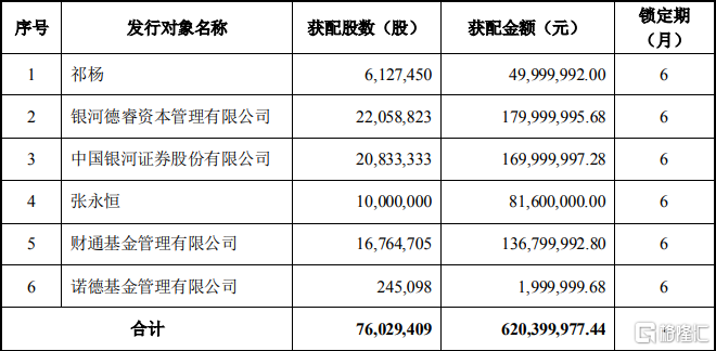 8月10日丨龙大肉食(002726.SZ)披露非公开发行A股股票发行情况报告书,确定此次发行价格为8.16元/股,发行股数约为7602.94万股,募资总额约为6.20亿元;发行对象最终确定为6位,锁定期为6个月。