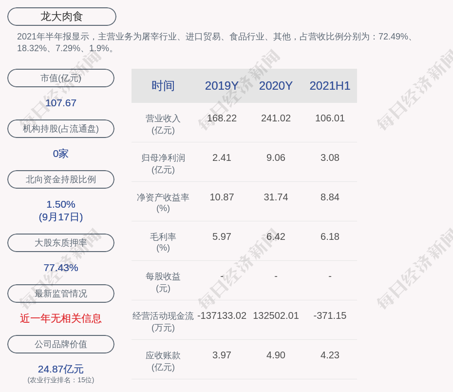 2021年半年报显示,龙大肉食的主营业务为屠宰行业、进口贸易、食品行业、其他,占营收比例分别为:72.49%、18.32%、7.29%、1.9%。