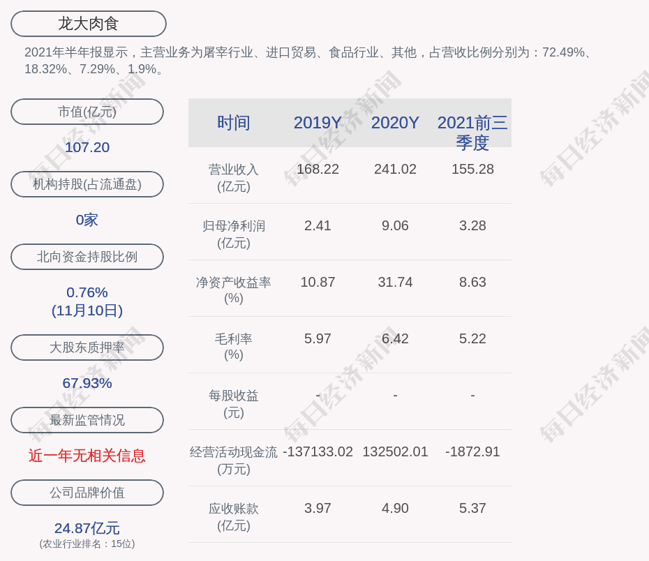 2021年半年报显示,龙大肉食的主营业务为屠宰行业、进口贸易、食品行业、其他,占营收比例分别为:72.49%、18.32%、7.29%、1.9%。