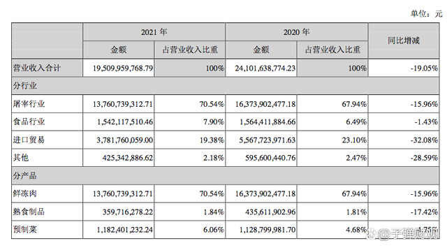 尽管龙大美食想要在预制菜领域有更多作为,但从他们2020年和2021年的财报数据来看,他们60%到70%的营收贡献来自屠宰行业。从产品营收来看,2021年他们的预制菜贡献的营收也只占其总营收的6.06%。