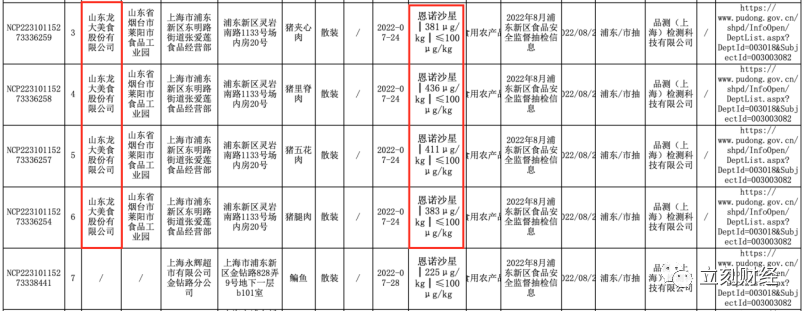信息显示,标识生产企业为山东龙大美食股份有限公司的猪里脊肉、猪五花肉、猪夹心肉和猪腿肉四种产品普遍存在恩诺沙星超标的问题,上述四种产品检测出的恩诺沙星含量分别为436μg/kg、411μg/kg、381μg/kg、383μg/kg。