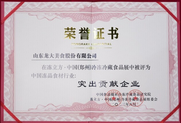 在同期举办的2023中国冻品食材行业食鼎奖颁奖仪式上,龙大美食获得中国冻品食材行业“突出贡献企业”奖项。凭借上游资源型企业优势,龙大美食向客户和消费者提供从生鲜品到预制食材的不同种类食材类产品,推动冻品食材行业的高质量发展。