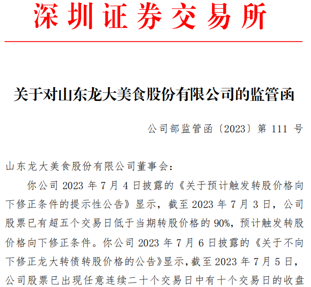 7月21日,深交所向山东龙大美食股份有限公司发出监管函:你公司2023年7月4日披露的《关于预计触发转股价格向下修正条件的提示性公告》显示,截至2023年7月3日,公司股票已有超五个交易日低于当期转股价格的90%,预计触发转股价格向下修正条件。你公司2023年7月6日披露的《关于不向下修正龙大转债转股价格的公告》显示,截至2023年7月5日,公司股票已出现任意连续二十个交易日中有十个交易日的收盘价低于当期转股价格的90%的情形,已触发转股价格修正条款;你公司董事会7月5日召开会议,决定本次不行使“龙大转债”的转股价格向下修正的权利,同时未来三个月内如再次触发转股价格向下修正条款,亦不提出向下修正方案。