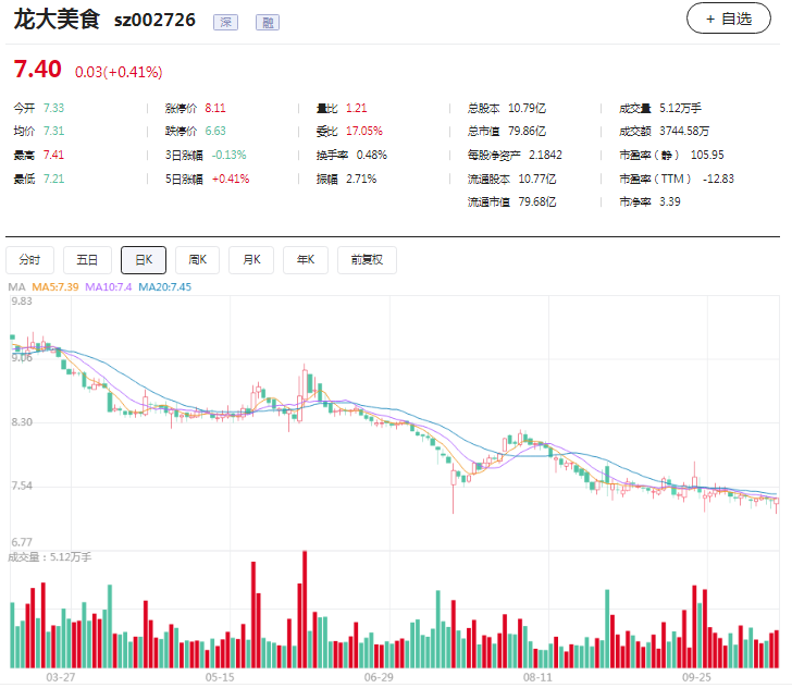 二级市场看,截至10月20日收盘,龙大美食今年以来跌幅超19%,目前总市值79.86亿元。