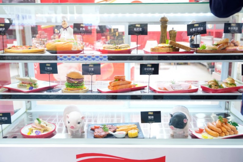 在产品展示上,红烧肥肠、萝卜丝肉丸、椒香酥肉、龙大鲜食记肉肠、金汤酸菜鱼、水煮肉片、厚切猪排等热门产品汇集。同时,本次展会特辟大客户定制产品专区,展示烤肠、培根等系列产品在披萨、汉堡、三明治等西快渠道产品中的场景应用。