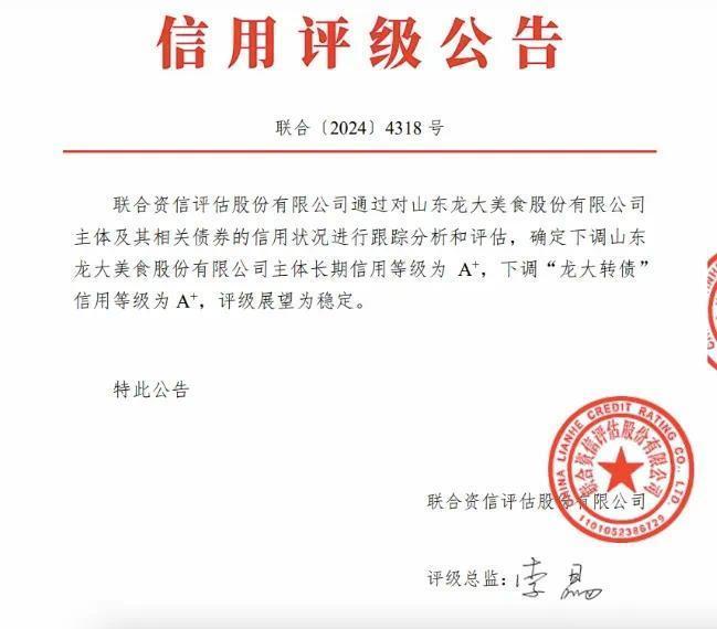 近日,联合资信公告称,将龙大美食主体及“龙大转债”信用等级由“AA-”下调至“A+”,评级展望稳定。