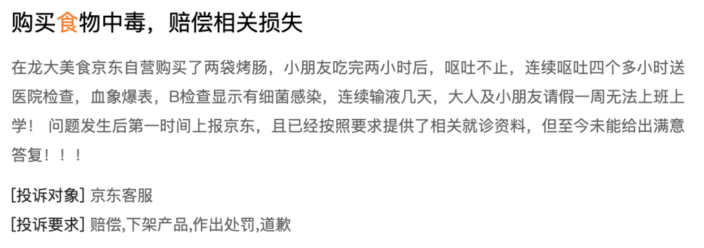 在黑猫投诉平台上,有多条关于龙大美食的食品安全投诉,包括在拼多多、京东龙大美食专卖店等购买的产品出现的问题,如香肠发黑发霉、造成食物中毒等。