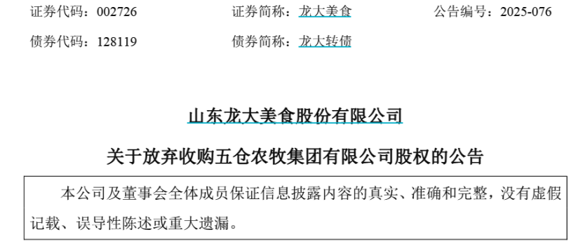 9月20日,龙大美食(SZ.002726)发布公告称,公司召开第六届董事会第五次会议,审议通过了《关于放弃收购五仓农牧集团有限公司股权的议案》,同意公司放弃收购控股股东蓝润发展控股集团有限公司(以下简称“蓝润发展”)所持有的五仓农牧集团有限公司股权(以下简称“五仓农牧”)。