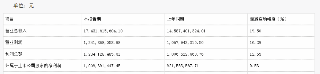 报告期内,公司实现营业收入1,743,161.56万元,较上年同期增长19.50%;营业利润124,186.81万元,较上年同期增长16.29%;利润总额123,412.85万元,较上年同期增长12.55%;归属于上市公司股东的净利润100,939.14万元,较上年同期增长9.53%。