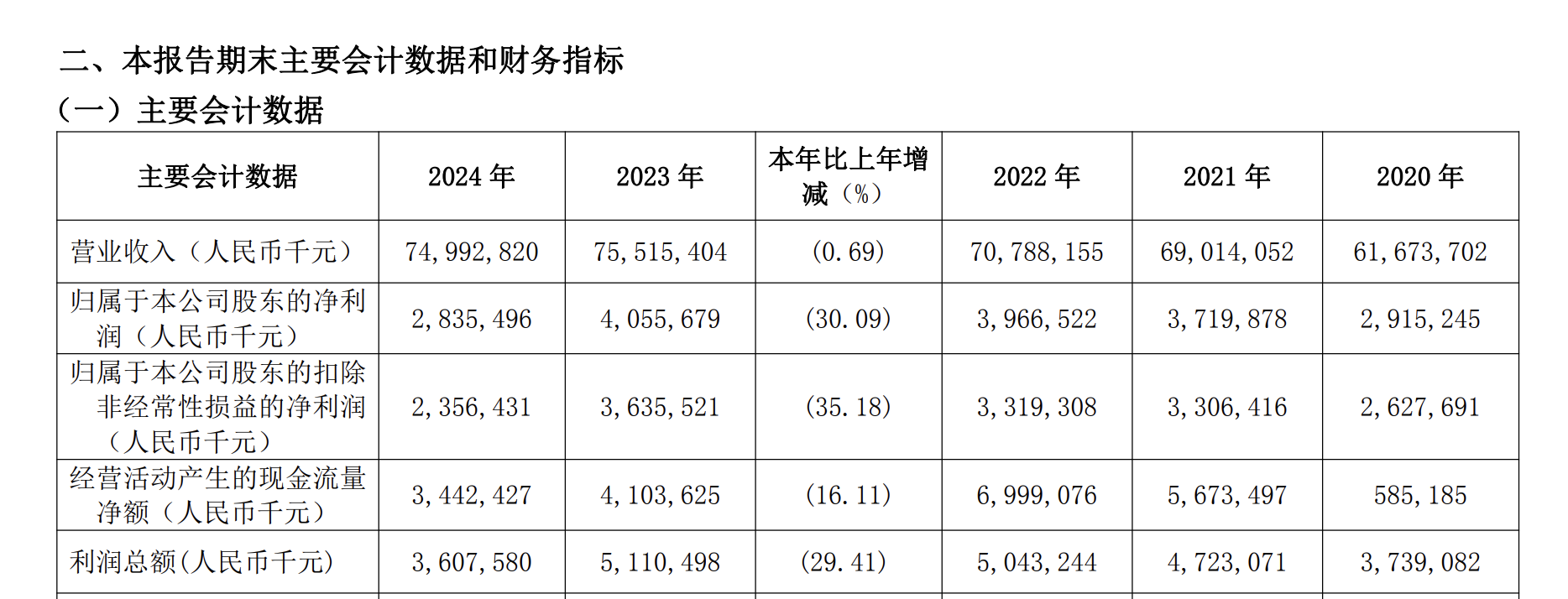 3月13日,白云山(600332)发布2024年年报,2024年,白云山实现营业收入749.93亿元,同比下降0.69%;实现净利润28.35亿元,同比下降30.09%。分季度来看,白云山于2024年四季度业绩出现亏损,当期亏损约3.23亿元。