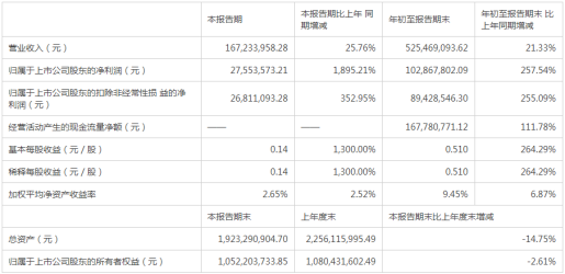 特一药业发布了2021年前三季度业绩报告,报告期内,该公司实现营业收入5.25亿元,同比增长了21.33%;归属于上市公司股东的扣非前和扣非后分别为1.03亿元和8943万元,同比分别增长了257.54%和255.09%;同期经营活动产生的现金流量净额为1.68亿元,同比增长了111.78%。