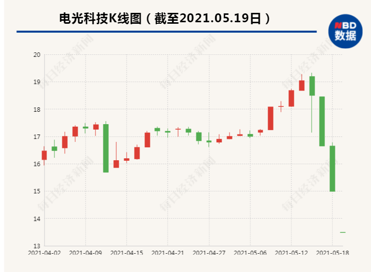 连续三天离奇下跌之后,电光科技(002730.SZ)5月19日来了个干脆——直接躺平……