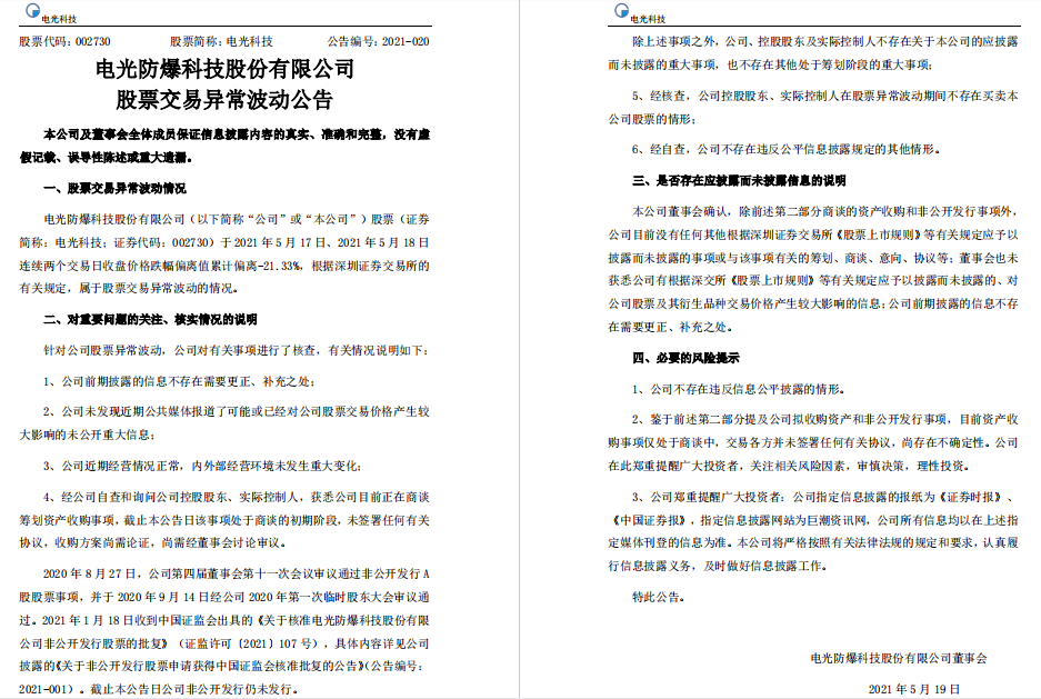 针对股价的异常波动,今天凌晨,电光科技也发布了公告,共列举了6条说明。但总之只有一句话:公司没啥问题。这也于电光科技此前在“互动易”平台中对投资者的回应一致:公司目前生产经营稳定,一切正常。