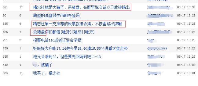 此前,股吧里有股友表示:“精忠社就是大骗子,杀猪盘,在群里说实话立马就被踢出”。也有网友表示:“精忠社第一支推荐的股票就被杀猪,不按套路出牌啊”。