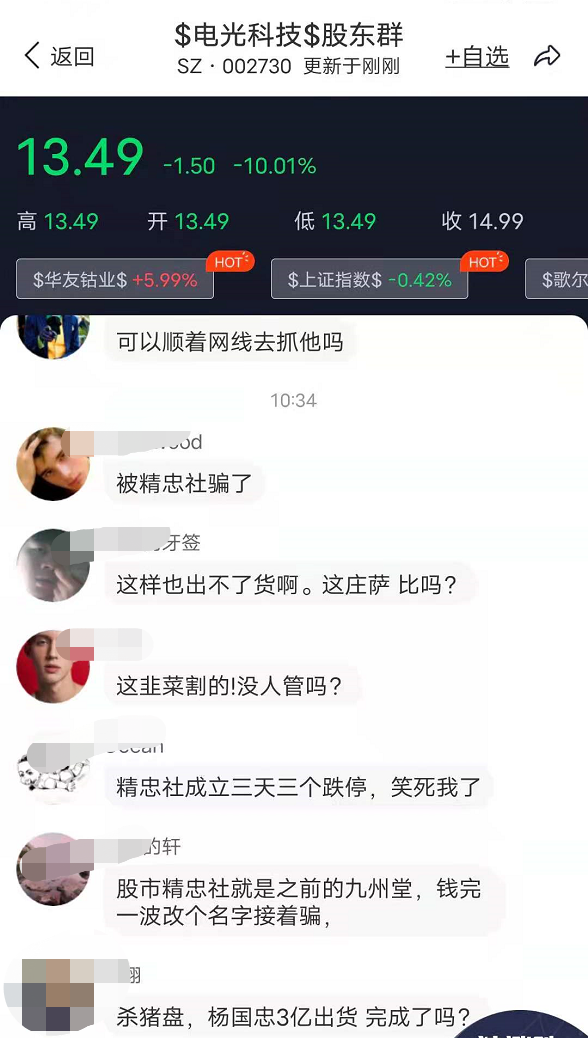 不过,在尺度电光科技股东群里,有股民表示,“被精忠社杨国忠骗进来的,可以顺着网线去抓他吗?”,还有股民表示,“股市精忠社,就是之前的九州堂,骗完一波,改个名字接着骗!”。