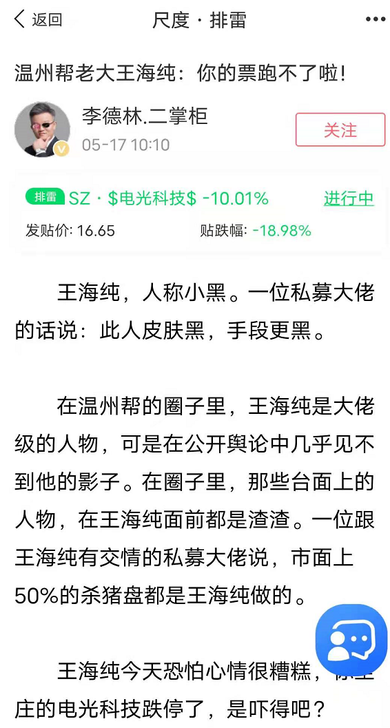 投资者爆料帖中,还曝光了王海纯与电光科技故事的细节,说的是在2017年,王海纯找第三方接盘,原本说好的是2个亿资金接盘,等到对方进场时,王海纯将筹码一股脑儿砸过去了,接盘者最终出资10个亿才稳住了股价。