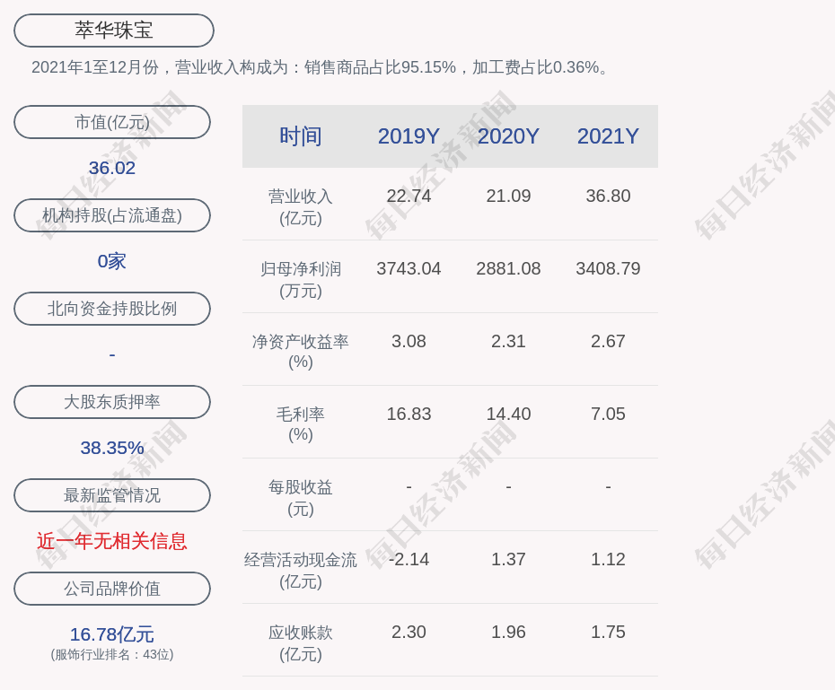 2021年1至12月份,萃华珠宝的营业收入构成为:销售商品占比95.15%,加工费占比0.36%。