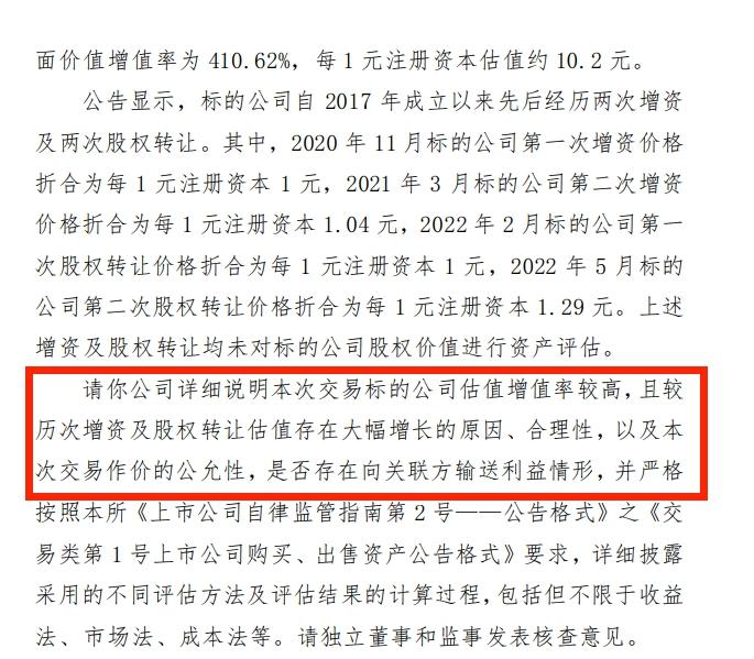 关注函提到,标的公司自2017年成立以来先后经历两次增资及两次股权转让。其中,2020年11月标的公司第一次增资价格折合为每1元注册资本1元,2021年3月标的公司第二次增资价格折合为每1元注册资本1.04元,2022年2月标的公司第一次股权转让价格折合为每1元注册资本1元,2022年5月标的公司第二次股权转让价格折合为每1元注册资本1.29元。上述增资及股权转让均未对标的公司股权价值进行资产评估。