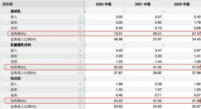 2021年中期,公司液体乳销售收入3.57亿元,占比超越乳酸菌乳饮料,达到37.67%;2022年中期,液体乳销售收入3.5亿元,占比达到38.98%。不过,液体乳毛利润水平较低,且毛利率下降幅度大。