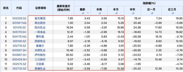 分开来看,本月阳光乳业涨跌幅最高,为18.96%;其次是一鸣食品,涨跌幅16.13%;燕塘乳业涨跌幅10.39%;而本周来看,皇氏集团涨跌幅3.56%,南达股份涨跌幅2.04%,燕塘乳业则为-7.06%;最新涨跌幅显示燕塘乳业为-3.59%。可以看出本周燕塘乳业的涨跌幅波动最大。