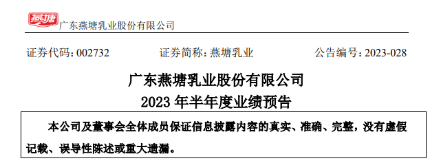 7月11日,燕塘乳业发布半年度业绩预告,公司预计2023年1-6月业绩大幅上升,归属于上市公司股东的净利润为8662.25万-1.01亿,净利润同比增长50.00%至75.00%,预计基本每股收益为0.5505至0.6423元。