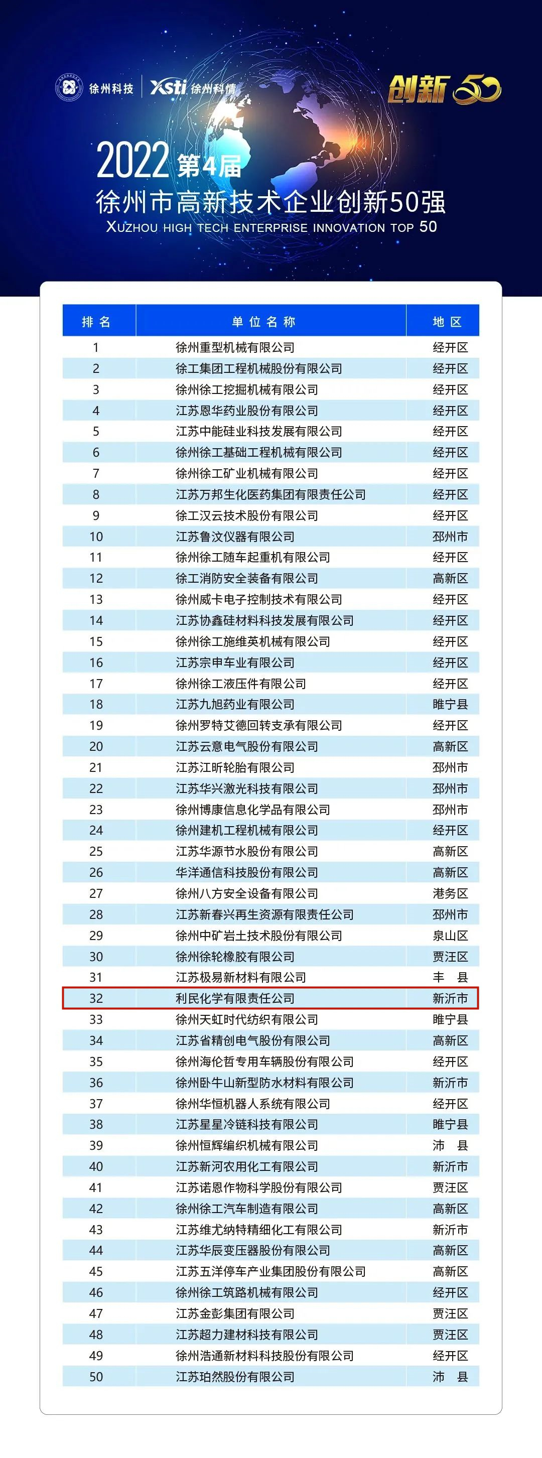 喜讯!近日,徐州市科技局发布了2022年“徐州市高新技术企业创新50强”榜单,利民股份全资子公司利民化学凭着创新投入强、创新产出优、创新绩效高等特点,在此次参与评选的1167家高新技术企业中脱颖而出登榜第32位,在新沂市入选企业中排名第一。