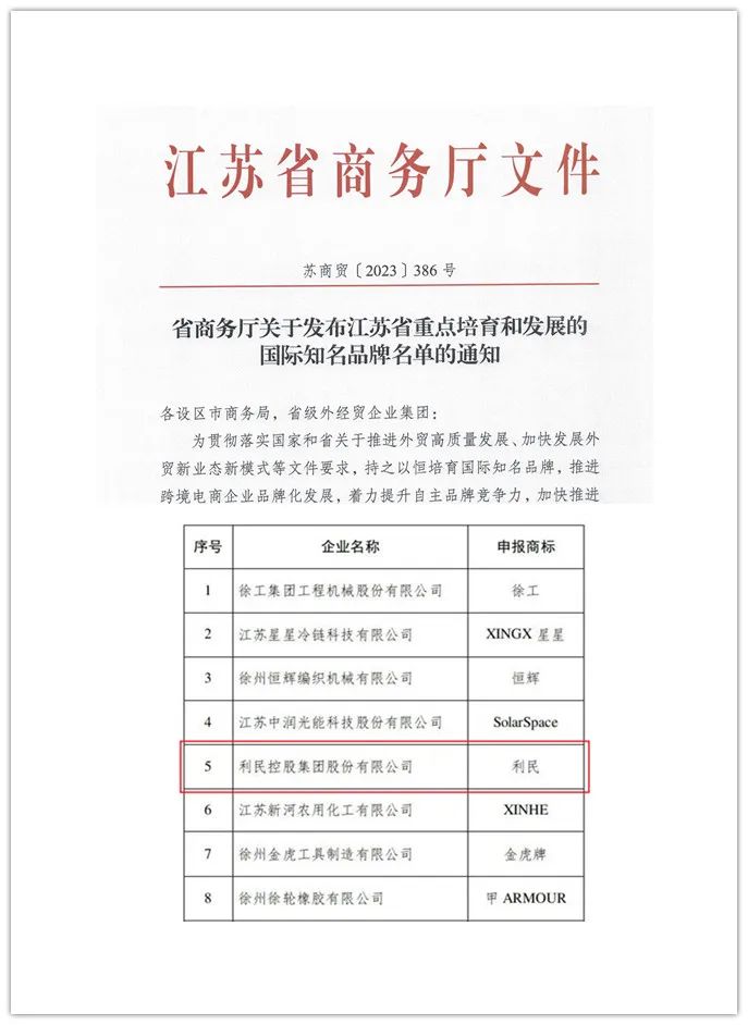 近日,江苏省商务厅公布了“2023-2025年度江苏省重点培育和发展的国际知名品牌名单”,“利民”品牌再次入选“江苏省重点培育和发展的国际知名品牌”。